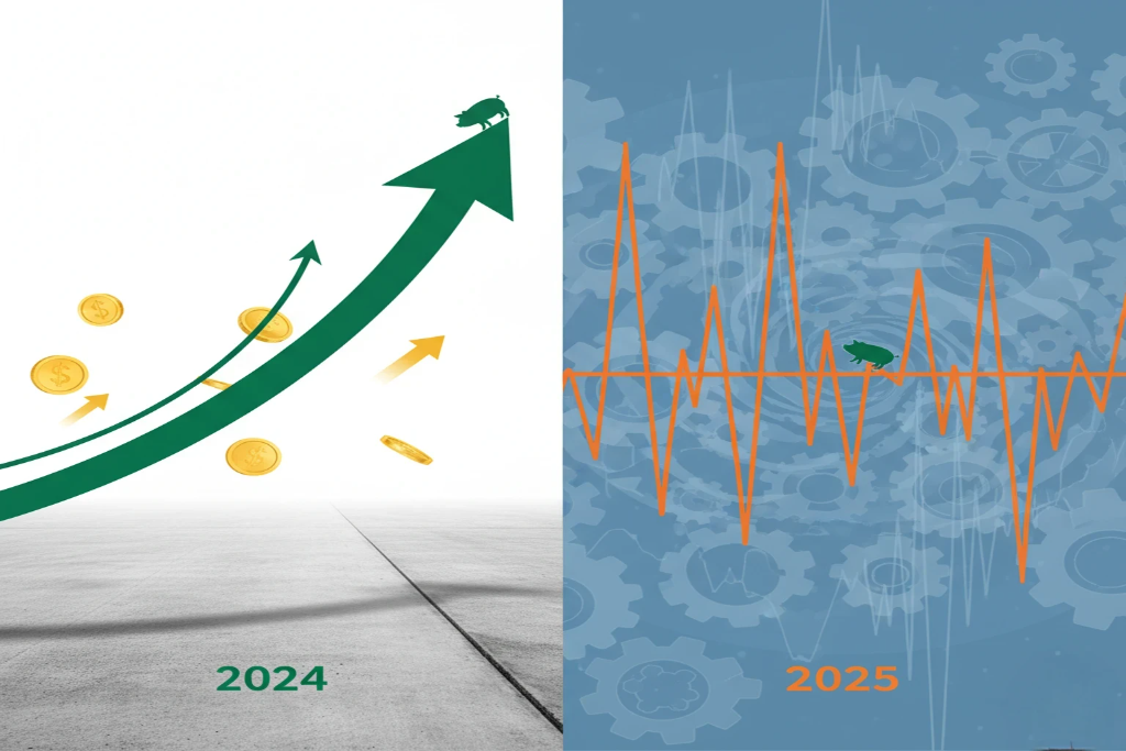 Em síntese, o suíno vivo em 2025 repete o bom desempenho externo, mas internamente os preços flutuam na faixa do teto, sem a mesma sustentação linear de 2024.