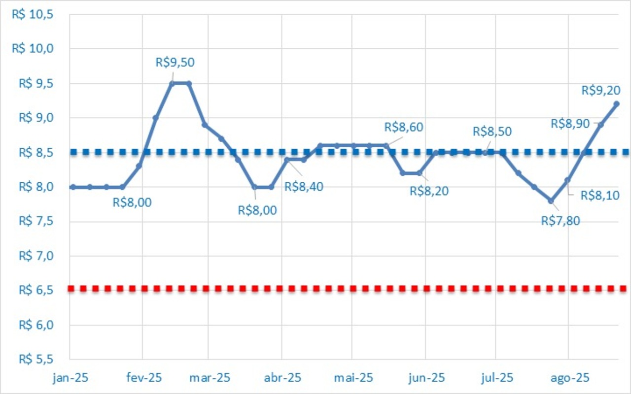 O mercado rompeu esse patamar em fevereiro, quando chegou a R$ 9,50, apoiado em animais de peso leve — mas não repetiu a mesma condição desde então. Em agosto, quando os preços novamente vieram à R$ 9,20 surge a dúvida é se há espaço para que o mercado consolide patamares acima da resistência ou se o teto continuará sendo a referência dominante.