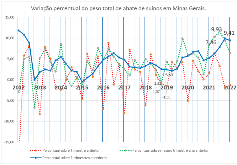 Na sequência, passamos a reclamar como se algo ou alguém estivesse nos imputando um sofrimento que não foi gerado pela própria cadeia de produção. Começamos a buscar inimigos externos para nos aliviar das próprias escolhas. E não podemos dizer que foram só alguns estados que cresceram porque a suinocultura mineira, último representante da suinocultura chamada independente e empresarial cresceu a tonelagem de carne suína abatida em 9,41 % em bases anuais agora no primeiro trimestre de 2022.