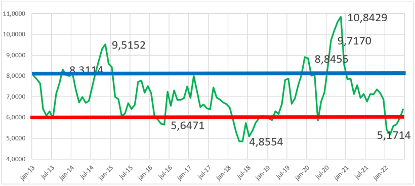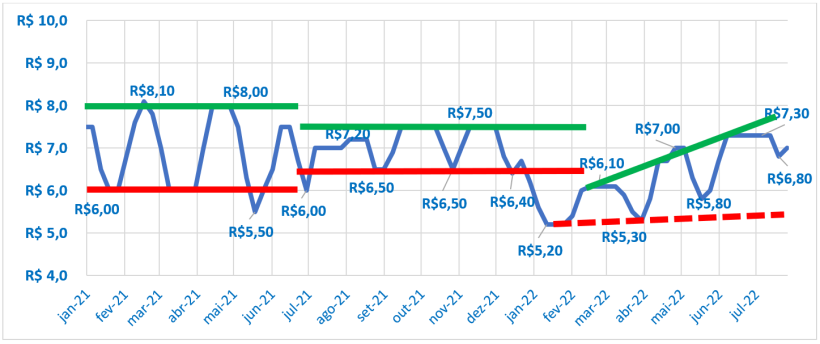 Depois de deflacionarmos os preços de Minas Gerais, como referência, temos os níveis de R$ 6,0 como suporte e R$ 8,0 como resistência. Fora disso são “momentos especiais” que também existem.